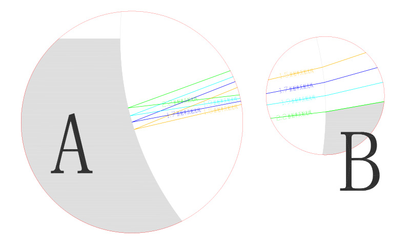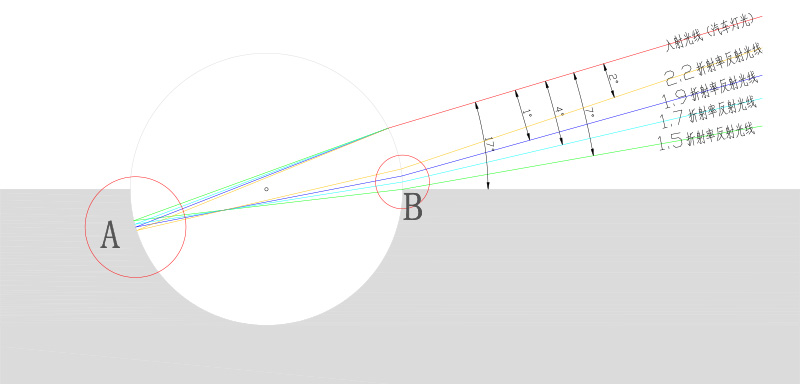 通過(guò)CAD精確制圖所作的數(shù)理分析模型,我們發(fā)現(xiàn)反射光線與入射光線的夾角隨著玻璃珠折射率的變化而變化,1.9折射率的玻璃珠平行度最好,其綜合光性能達(dá)到最佳。當(dāng)折射率>1.9后,隨著折射率的增加,有效的平行反射光線會(huì)逐漸下降。
